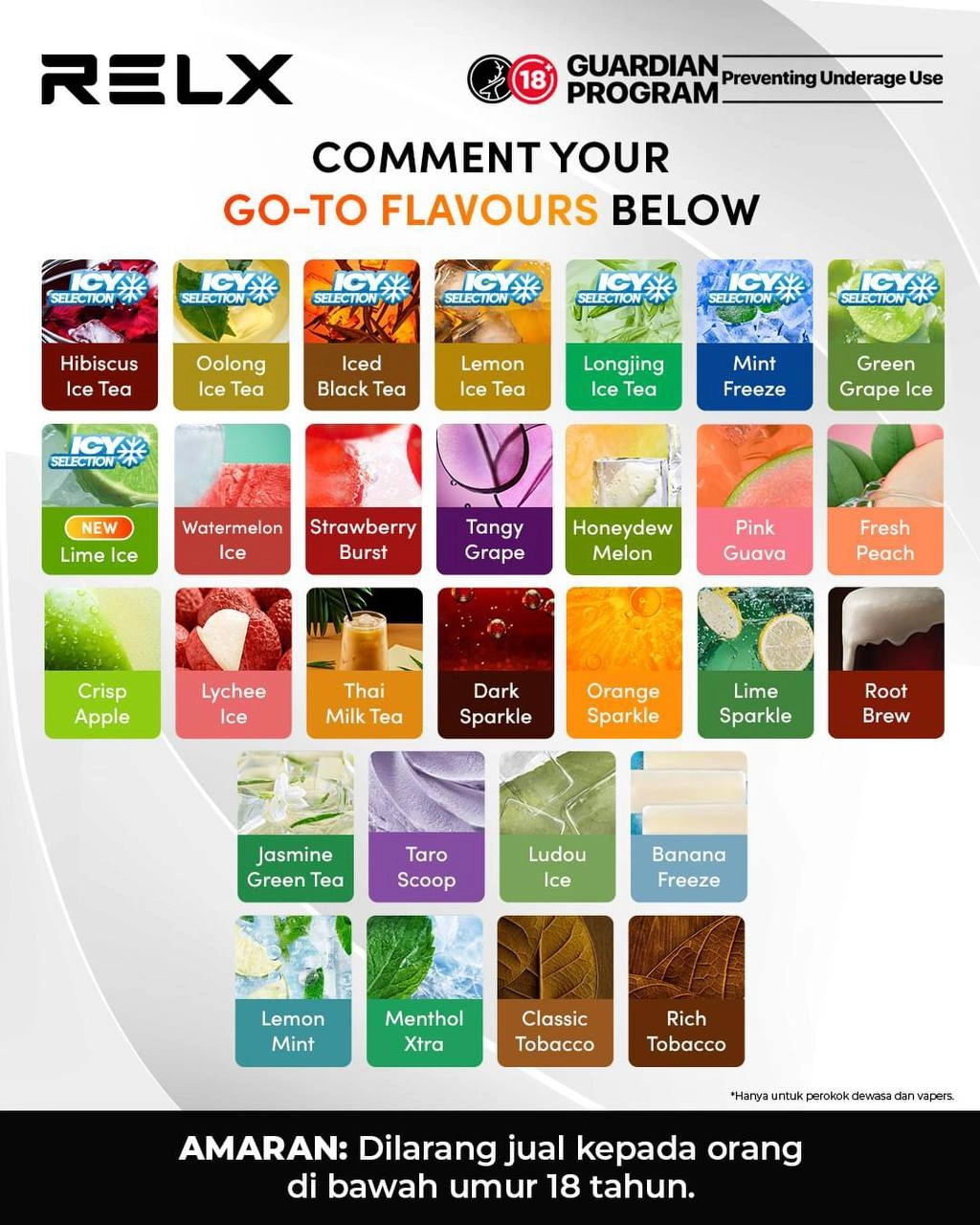 20种口味可选,下方描述页面有凉度图表以供参考。马来西亚政府最新规定,尼古丁浓度均为2%