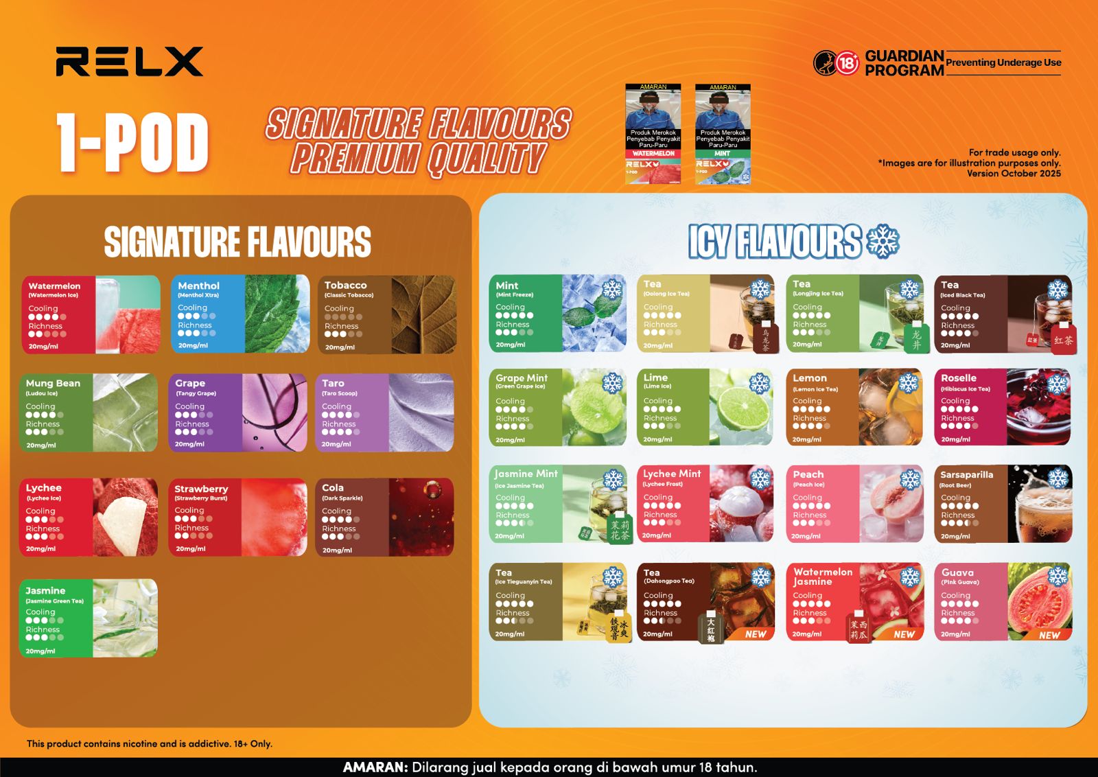 | 口味 | Watermelon Ice 西瓜, Tangy Grape 葡萄, Strawberry 草莓, Dark Sparkle 可乐, Ludou Ice 绿豆, Taro 香芋, Lychee Ice 荔枝, Jasmine 茉莉绿茶, Menthol Xtra 新薄荷, Classic Tobacco 经典烟草, Oolong Ice Tea 乌龙冰茶, Hibiscus Ice Tea 洛神花茶, Lemon Ice Tea 柠檬冰茶, Grape Mint 绿葡萄冰, Lime Ice 青柠冰, Mint Freeze 零度薄荷, Jasmine Mint 茉莉绿茶冰, Lychee Mint 荔枝冰, Peach Ice 桃子冰, Root Beer 沙示冰 |