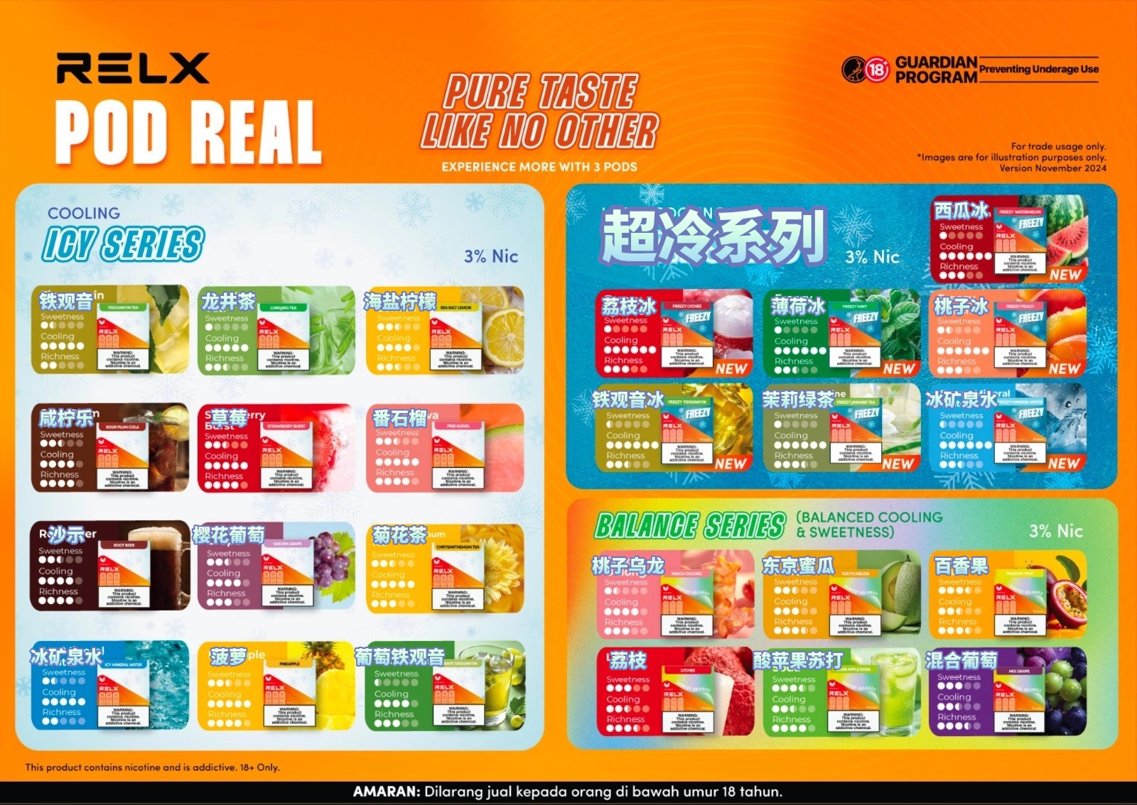 口味 | TieGuanYin Tea 铁观音2%, LongJing Tea 龙井2%, Icy Mineral Water 冰矿泉水, Root Beer 沙示2%, Sour Plum Cola 咸柠乐2%, Sakura Grape 樱花葡萄, Chrysanthemum Tea 菊花茶3%, Sea Salt Lemon 海盐柠檬2%, Pink Guava 番石榴2%, Strawberry Burst 草莓2%, Pineapple 菠萝2%, Sea Salt Mango 海盐芒果3%, Grape Tieguanyin 葡萄铁观音3%, Mix Grape 混合葡萄3%, Passion fruit 百香果3%, Sour apple soda 酸苹果苏打, Lychee 荔枝3%, Tokyo melon 东京蜜瓜3%, Peach oolong 桃子乌龙, Orange Americano 橙C美式, Freezy Watermelon 西瓜冰3%, Freezy Lychee 荔枝冰3%, Freezy Mint 薄荷冰3%, Freezy Peach 桃子冰3%, Freezy Tieguanyin 铁观音冰3%, Freezy Jasmine Tea 茉莉绿茶3%, Freezy Mineral Water 冰矿泉水(超凉)3% |